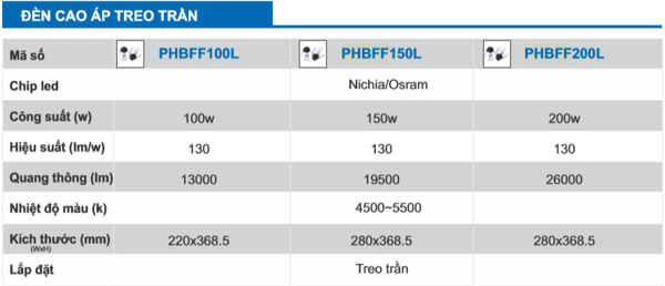 - Nhờ sử dụng Chip LED hiện đại, giúp tiết kiệm năng lượng, đồng thời nâng cao tuổi thọ của đèn cao áp treo trần PHBFF150L